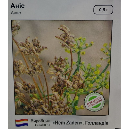 Аніс - лікарська однорічна трав'яниста рослина Висотою до 60 см. Цвіте з червня по вересень. Використовують дозрілі плоди анісу, які містять ефірне масло. Препарати з плодів анісу затримують розвиток шкідливих організмів в кишечнику, знімають спазми органів травлення, мають відхаркувальні і сечогінні властивості.